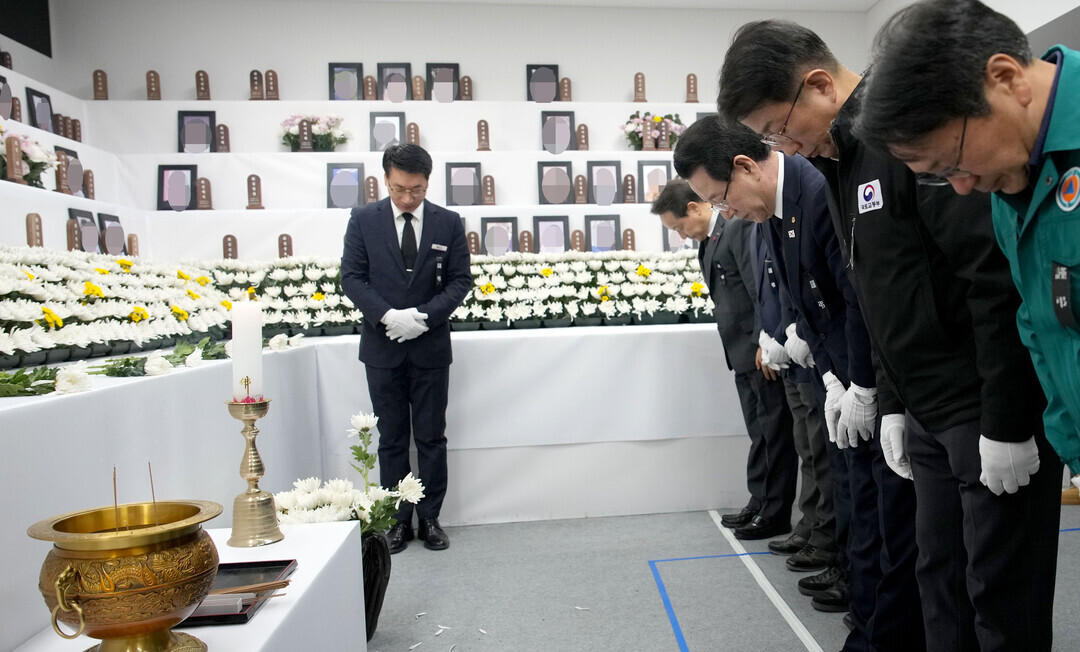 ▲ 지난해 12월31일 김영록 전라남도지사와 강기정 광주시장이 제주항공 여객기 추락사고 희생자 179명의 위패와 영정을 모신 무안공항 합동분향소에서 헌화를 하며 희생자들의 넋을 기리고 있다. [전남도 제공]