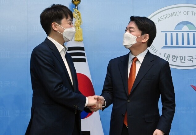 | ▲ 이준석 전 국민의힘 대표와 안철수 국민의힘 의원이 지난해 4월 서울 여의도 국회 소통관에서 악수하고 있다. [뉴시스] |