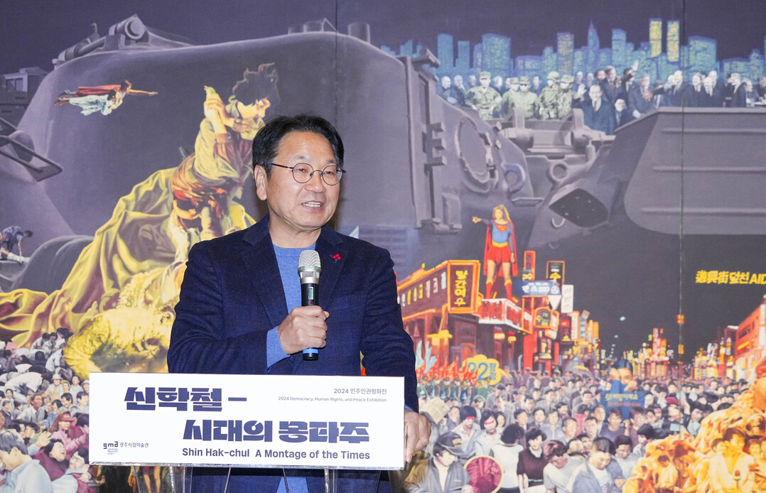 ▲ 강기정 광주광역시장이 20일 오후 광주시립미술관에서 개막한 2024 민주인권평화전 '신학철-시대의 몽타주 60년 회고전'에 참석해 인사말을 하고 있다. 전시회는 2025년 3월 30일까지 열린다. [광주광역시 제공]