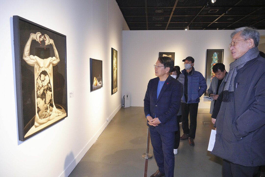 ▲ 강기정 광주광역시장이 20일 오후 광주시립미술관에서 개막한 2024 민주인권평화전 '신학철-시대의 몽타주 60년 회고전'에 참석해 작품을 둘러보고 있다. 전시회는 2025년 3월 30일까지 열린다. [광주광역시 제공]