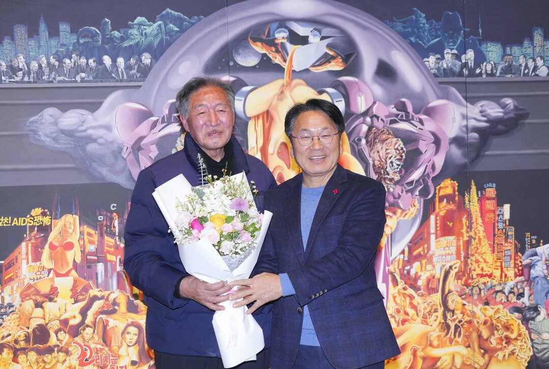 ▲ 강기정 광주광역시장(오른쪽)이 20일 오후 광주시립미술관에서 개막한 2024 민주인권평화전 '신학철-시대의 몽타주 60년 회고전'에 참석해 신작가(왼쪽)에게 꽃다발을 전달하고 있다. 전시회는 2025년 3월 30일까지 열린다. [광주광역시 제공]