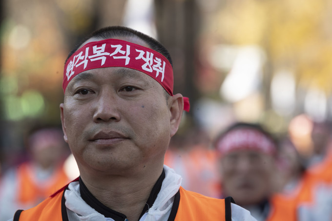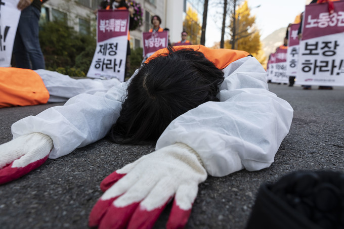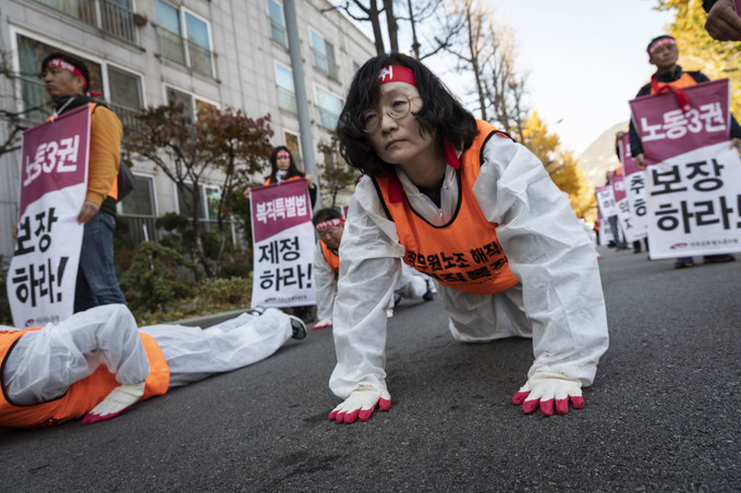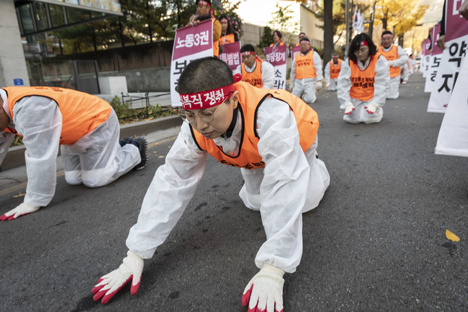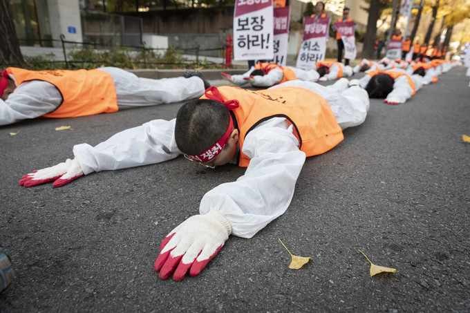 전국공무원노동조합이 12일 오후 서울 종로구 청와대 앞 분수대 광장에서 해직자 원직복직 쟁취 총력투쟁 선포 기자회견을 마치고 오체투지를 하고 있다.