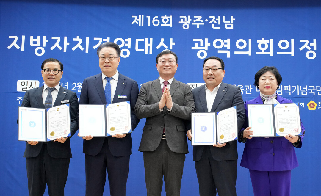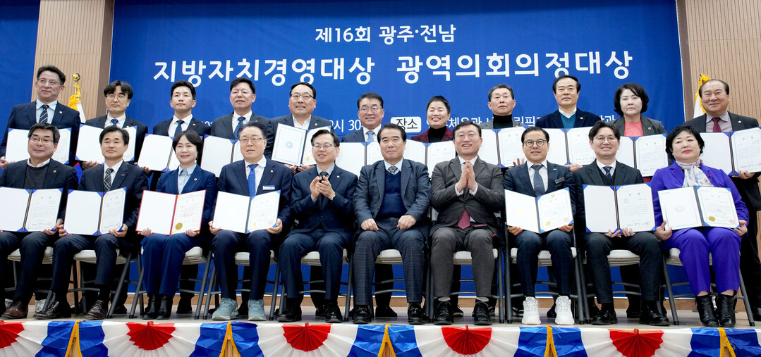 ▲ 명창환(가운데) 전라남도 행정부지사가 27일 광주 올림픽기념국민생활관에서 열린 '제16회 광주·전남 지방자치경영대상·광역의회 의정대상 시상식' 행사에서 수상자들과 기념촬영을 하고 있다. [전남도 제공]