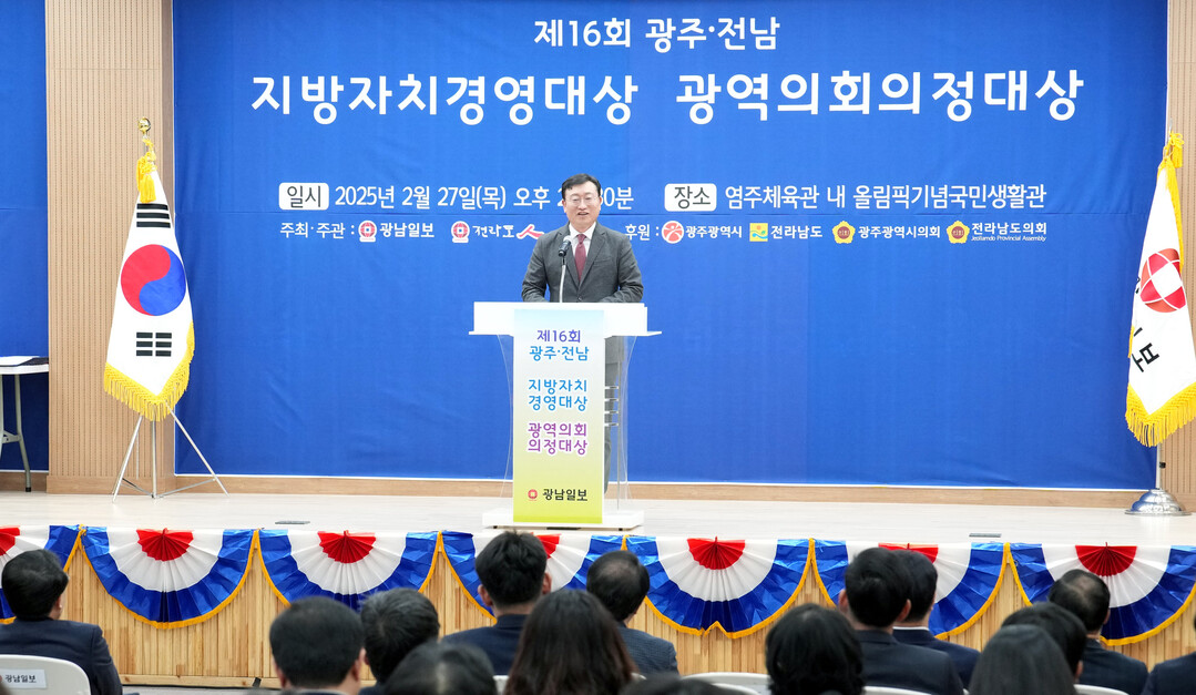 ▲ 명창환(가운데) 전라남도 행정부지사가 27일 광주 올림픽기념국민생활관에서 열린 '제16회 광주·전남 지방자치경영대상·광역의회 의정대상 시상식' 행사에서 인사말을 하고 있다. [전남도 제공]