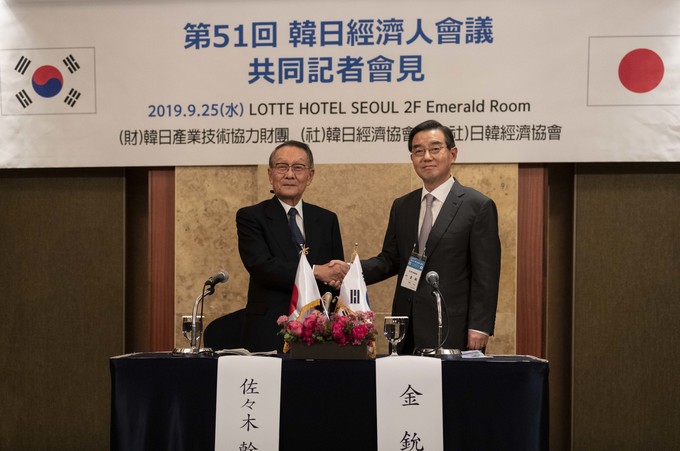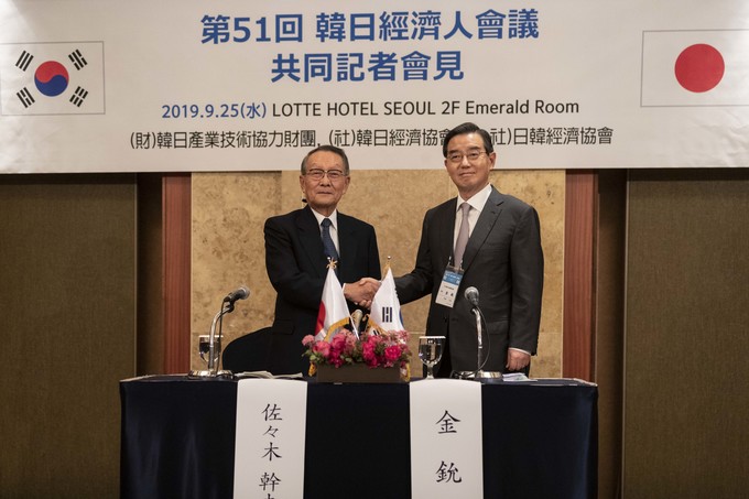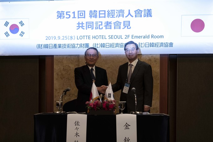 25일 오후 서울 중구 롯데호텔에서 열린 '제51회 한일경제인회의' 공동기자회견에 참석한 김윤 한일경제협회 회장(오른쪽)과 사사키 미키오 일한경제협회 회장이 악수를 하고 있다.