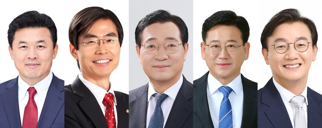 | ▲ 국민의힘 윤영석(경남 양산갑·왼쪽부터), 조경태(부산 사하을) 후보, 더불어민주당 민홍철(경남 김해갑), 김정호(경남 김해을), 전재수(부산 북갑) 후보. [중앙선거관리위원회] |