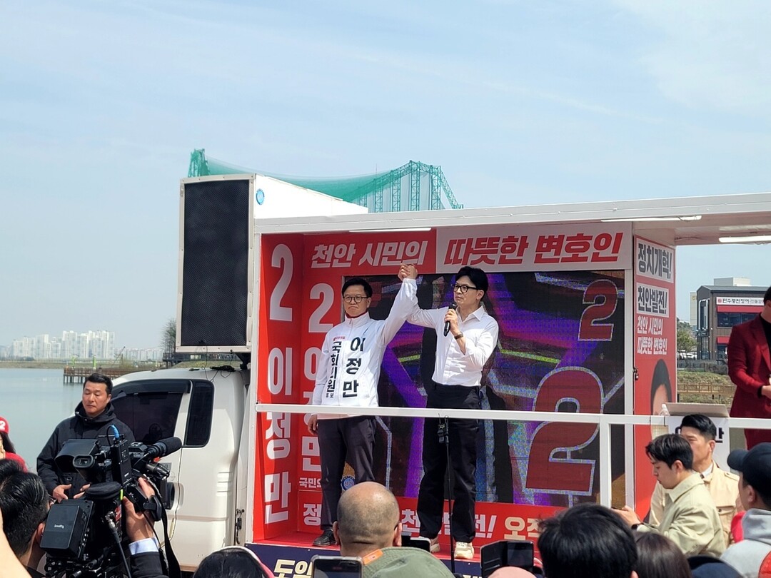 국민의힘 한동훈 비대위원장이 2일 '천안을' 성성호수공원 UCC카페거리에서 이정만 후보와 함께 집중 유세를 한가운데 둘의 인연도 관심을 끌고 있다.