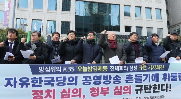 ▲ 전국언론노동조합, 한국방송기자연합회, 한국인터넷기자협회, 한국진보연대 등 단체 관계자들이 21일 서울 한국방송회관 앞에서 방송통신심의위원회의 KBS '오늘밤 김제동' 정치 심의 규탄 기자회견을 열고 구호를 외치고 있다. [뉴시스]