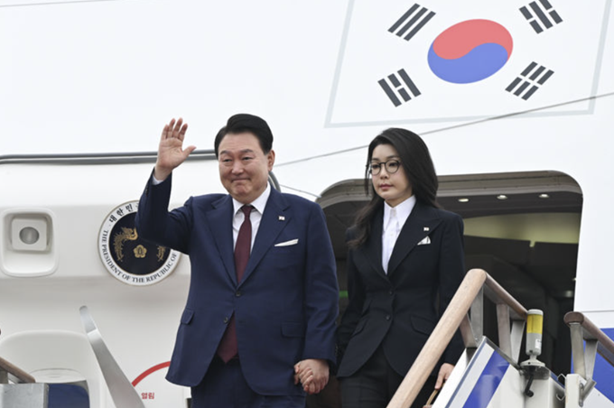 ▲사우디아라비아·카타르 순방을 마치고 귀국한 윤석열 대통령과 부인 김건희 여사가 지난 10월 26일 경기도 성남 서울공항에 도착해 공군 1호기에서 내리며 인사하고 있다. [뉴시스]