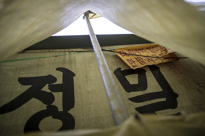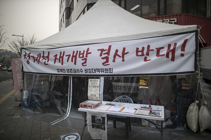 관수교 사거리에 천막을 치고 노숙농성 중인 청계천 생존권 사수 비상대책위원회(이하 비대위) 관계자가 서울시의 재개발 사업을 비판하며 호소했다.