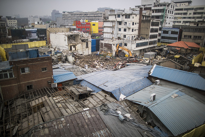 서울시내에 미세먼지가 가득차 뿌연 하늘을 보인 날. 청계천 공구상가에 도착했을 땐 이미 포클레인이 흙먼지를 내뿜으며 건물을 헐고 있었다.