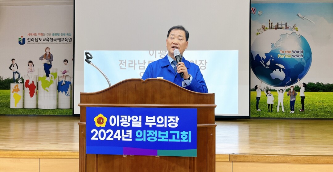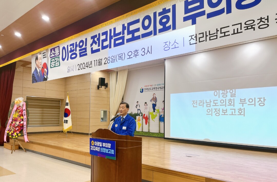▲ 28일 이광일 전라남도의회 부의장이 전라남도교육청 국제교육원에서 지역주민을 대상으로 2024 소통·공감 의정보고회를 갖고 있다. [강성명 기자]