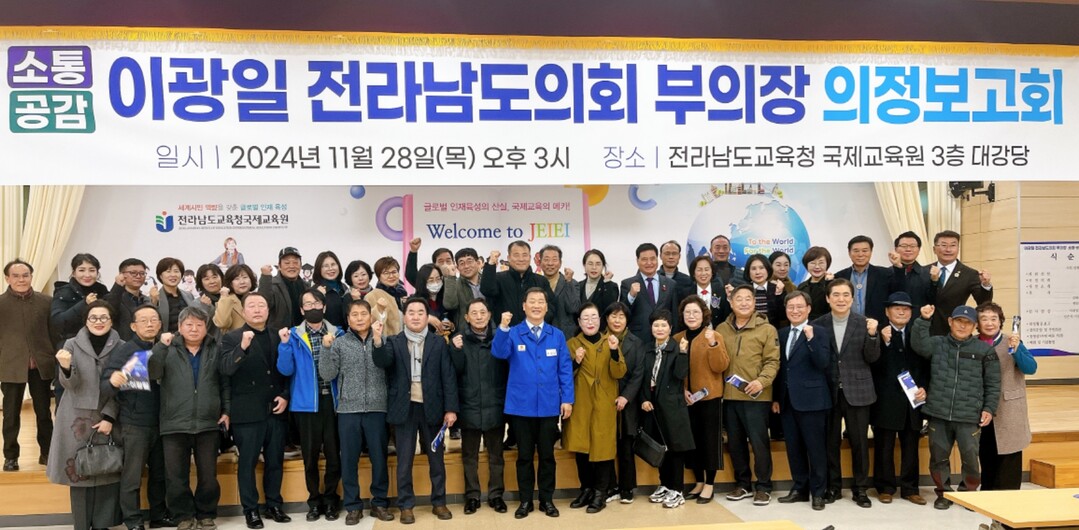▲ 28일 이광일 전라남도의회 부의장이 전라남도교육청 국제교육원에서 지역주민을 대상으로 2024 소통·공감 의정보고회를 가진 뒤 기념촬영을 하고 있다. [강성명 기자]