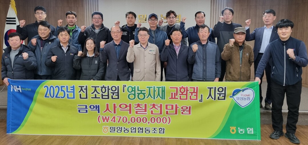 경남 밀양농협(조합장 이성수)은 14일 4700여 명 모든 조합원에 1인당 10만 원권 영농자재 무상 교환권(4억7000만 원 상당)을 지급했다.