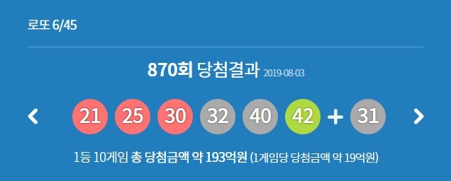 지난 3일 로또 수탁업체 동행복권은 복권통합포털을 통해 제870회 로또복권 당첨번호를 공개했다. 이날 발표된 1등 당첨번호는 21, 25, 30, 32, 40, 42며 2등 보너스번호는 31이다.