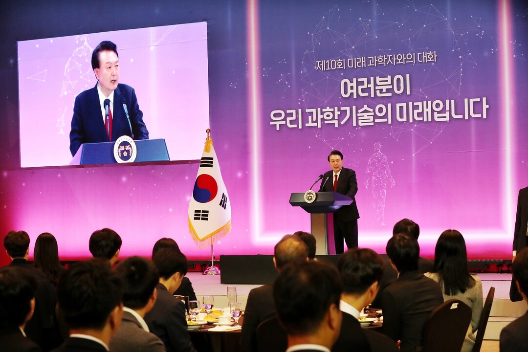| ▲대전 유성에서 열린 '미래과학자와의 대화'에 참석해 연설하고 있는 윤석열 대통령.[대전충남사진공동취재단 제공] |