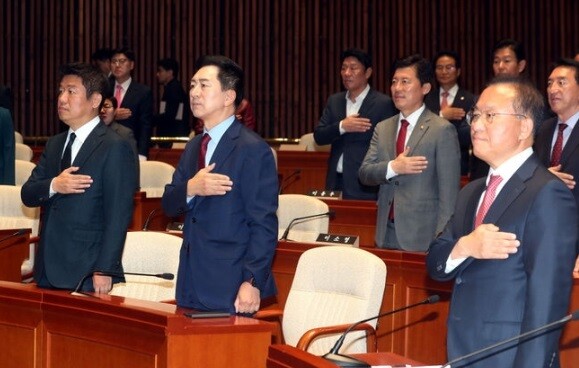 | ▲ 김기현 국민의힘 대표가 30일 오전 서울 여의도 국회에서 열린 의원총회에서 국민의례를 하고 있다. 왼쪽부터 유의동 정책위의장, 김 대표, 윤재옥 원내대표. [뉴시스] |