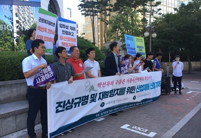 ▲ 지난해 8월 17일 오전 서울 송파구 근로복지공단 서울동부지사 앞에서 고 박선욱 간호사 유족과 공동대책위원회가 산업재해를 신청하기 전 기자회견을 하고 있다. [뉴시스]