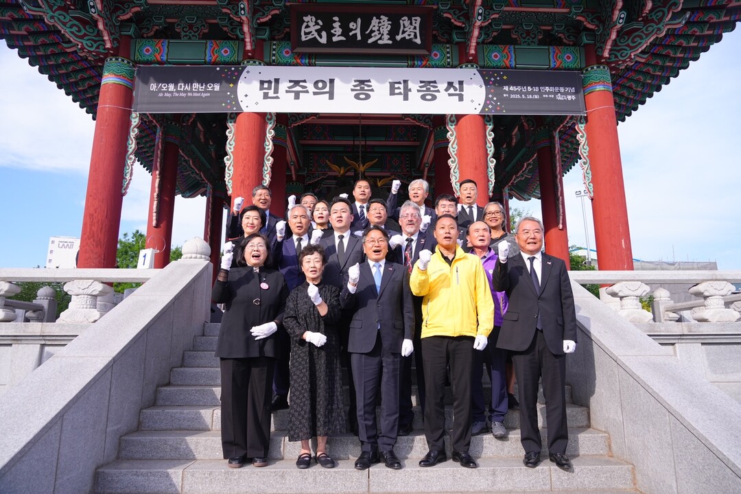 | ▲ 강기정 광주광역시장이 18일 오후 5·18민주광장 내 민주의 종각에서 제45주년 5·18민주화운동을 기념하기 위해 열린 '민주의 종' 타종식에 참여한 신수정 시의회의장, 이정선 광주시교육감, 양부남 더불어민주당 광주시당위원장, 5·18 기관‧단체장 등과 기념촬영을 하고 있다. [광주광역시 제공] |