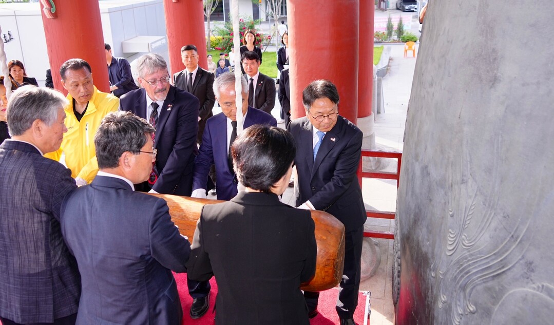 | ▲ 강기정 광주광역시장이 18일 오후 5·18민주광장 내 민주의 종각에서 제45주년 5·18민주화운동을 기념하기 위해 신수정 시의회의장, 이정선 광주시교육감, 양부남 더불어민주당 광주시당위원장, 5·18 기관·단체장 등과 함께 타종을 하고 있다. [광주광역시 제공] |