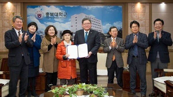 ▲지난 2018년 12월 충북대에 장학금을 기탁하고 있는 고 신언임 여사.[충북대 제공]