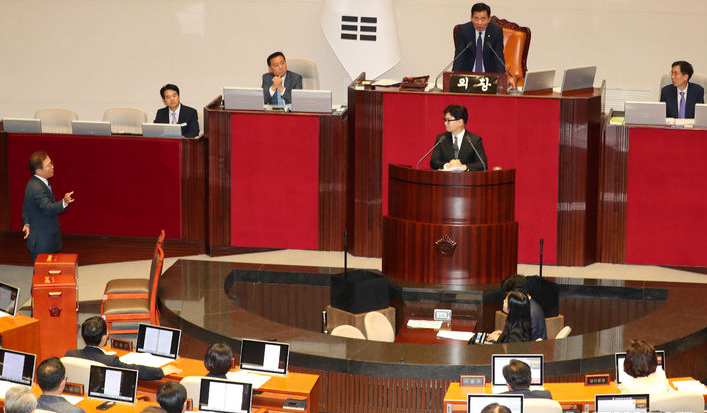 민주당 의원들은 한 장관이 설명을 시작한지 15분 정도 지나자 “이게 지금 뭐하는 겁니까” 등이라며 항의하기 시작했다. 김진표 국회의장은 “의원 여러분, 국민들이 관심을 가지고 지켜보고 있다” “의석에서 조용히 경청해달라”고 말했다.