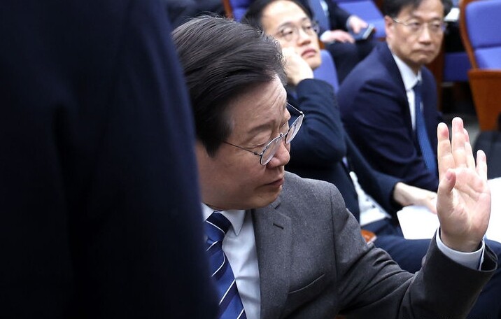 | ▲ 더불어민주당 이재명 대표(왼쪽)가 27일 국회에서 열린 의원총회에 참석하며 손을 들어 인사하고 있다. [뉴시스] |