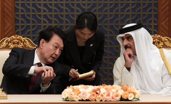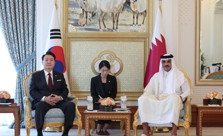 | ▲ 카타르를 국빈 방문한 윤석열 대통령이 25일(현지시간) 도하 아미리 디완 왕궁에서 타밈 빈 하마드 알사니 국왕과 한-카타르 확대회담을 하고 있다. [뉴시스] |