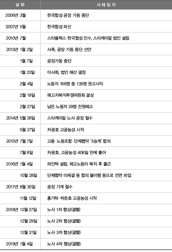 그러나 사 측은 스타플렉스로의 직접 고용은 물론, 복직 시 5명에 불과한 파인텍 노동자들을 이전 스타케미칼 단체협약 수준으로 보장할 수 없다고 맞서고 있다. 또 5명의 노동자들이 지나친 강성이라 본사로 받아들일 수 없다는 입장이다.
