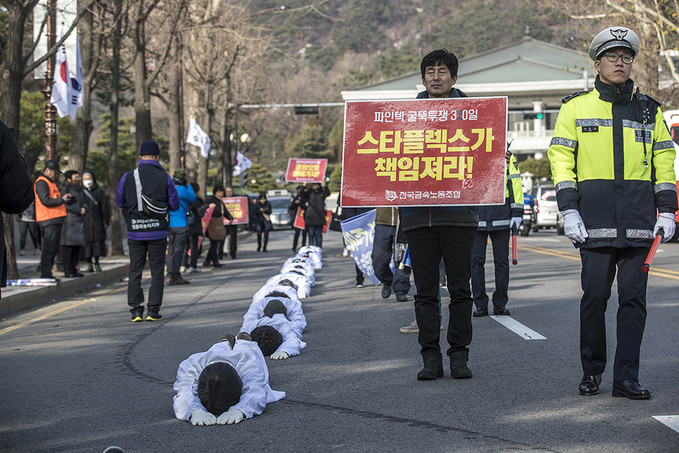 금속노조 파인텍지회 조합원들과 시민사회단체 등이 모인 '스타플렉스(파인텍) 투쟁 승리를 위한 공동행동'은 지난달 6일부터 10일까지 서울 종로구 청와대에서 스타플렉스 서울사무소까지 20km에 걸친 아스팔트 바닥을 오체투지로 이동했다. 두 팔과 양 무릎, 이마를 땅에 대고 절을 하는 오체투지를 통해 굴뚝 위의 두 노동자들을 반드시 땅에서 만나겠다는 결의를 모으기 위해서였다.