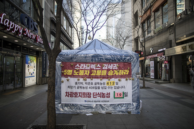 노사는 새해 들어 3일 4차 협상을 열었지만 역시 결렬됐다. 5차 협상 일정은 정해지지 않은 상황이다. 고공 농성 421일차인 지난 6일엔 홍기탁, 박준호 두 노동자가 무기한 고공 단식에 돌입했다. 협상이 지지부진한 상황을 타개하고자 목숨을 건 선택을 한 것이다.