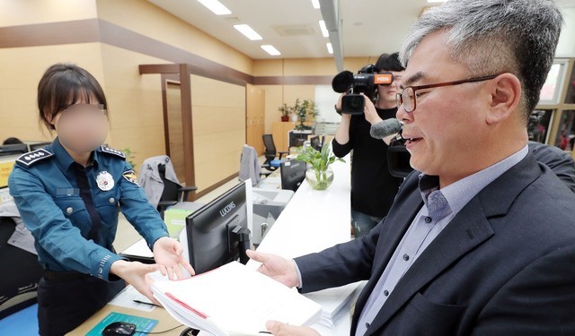 ▲ 김수민 작가의 법정대리인 박훈 변호사가 23일 오후 서울 종로구 서울지방경찰청 민원실에서 고(故) 장자연 사건 주요 증언자인 배우 윤지오 씨에 대한 고소장을 접수하고 있다. [뉴시스]