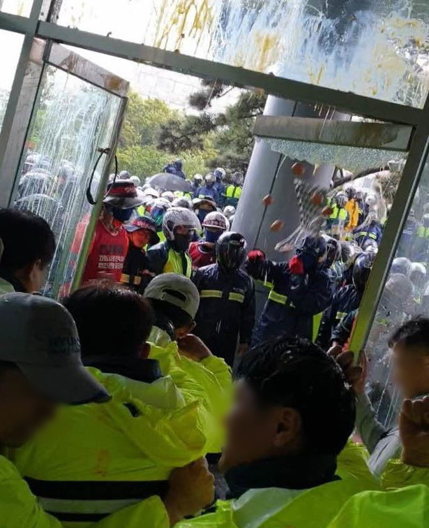 현관 유리문이 깨지고 몸싸움이 벌어져 회사 직원 7명이 부상을 입고 병원으로 옮겨졌다. 부상자 가운데 1명은 실명위기라고 회사는 전했다.