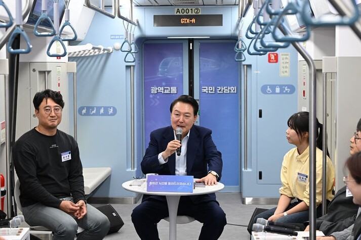 | ▲ 윤석열 대통령이 6일 경기 화성시 동탄역 GTX-A 노선 열차에서 광역교통 국민간담회를 하고 있다. [대통령실 제공] |