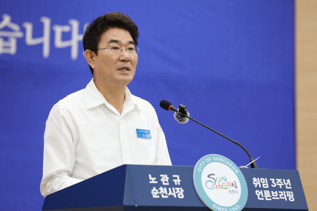 | ▲ 노관규 전남 순천시장이 민선 8기 3주년 기자회견에서 여수·순천·광양 메가시티 필요성에 대한 입장을 밝히고 있다. [순천시 제공] |