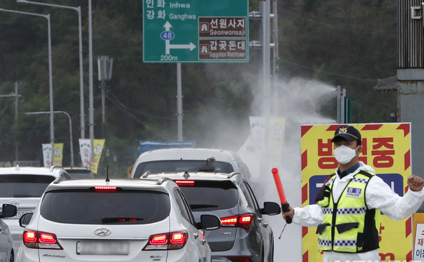 ▲ 25일 인천 강화대교에서 방역당국이 강화도로 진입하는 차량에 방역 작업을 하고 있다. [뉴시스]