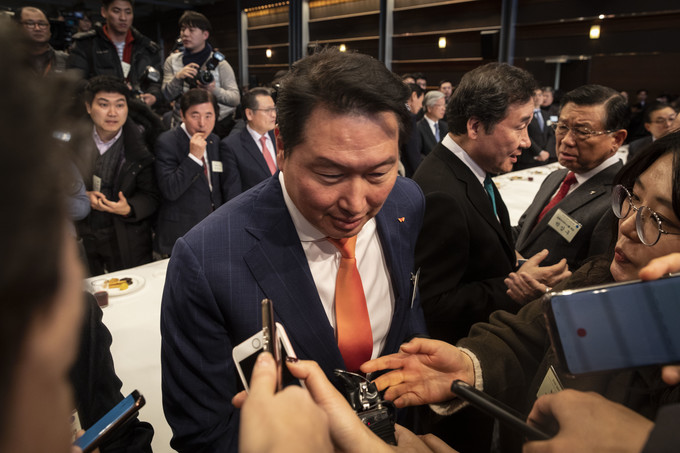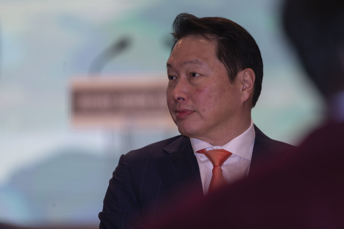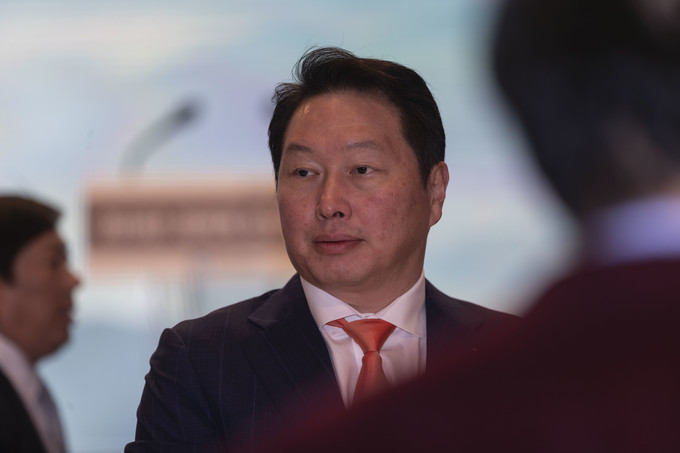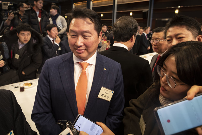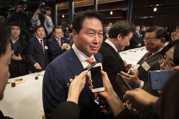 최태원 SK그룹 회장이 3일 오후 서울 강남구 코엑스 그랜드볼룸에서 열린 경제계 신년인사회를 마치고 기자들의 질문을 듣고 있다.