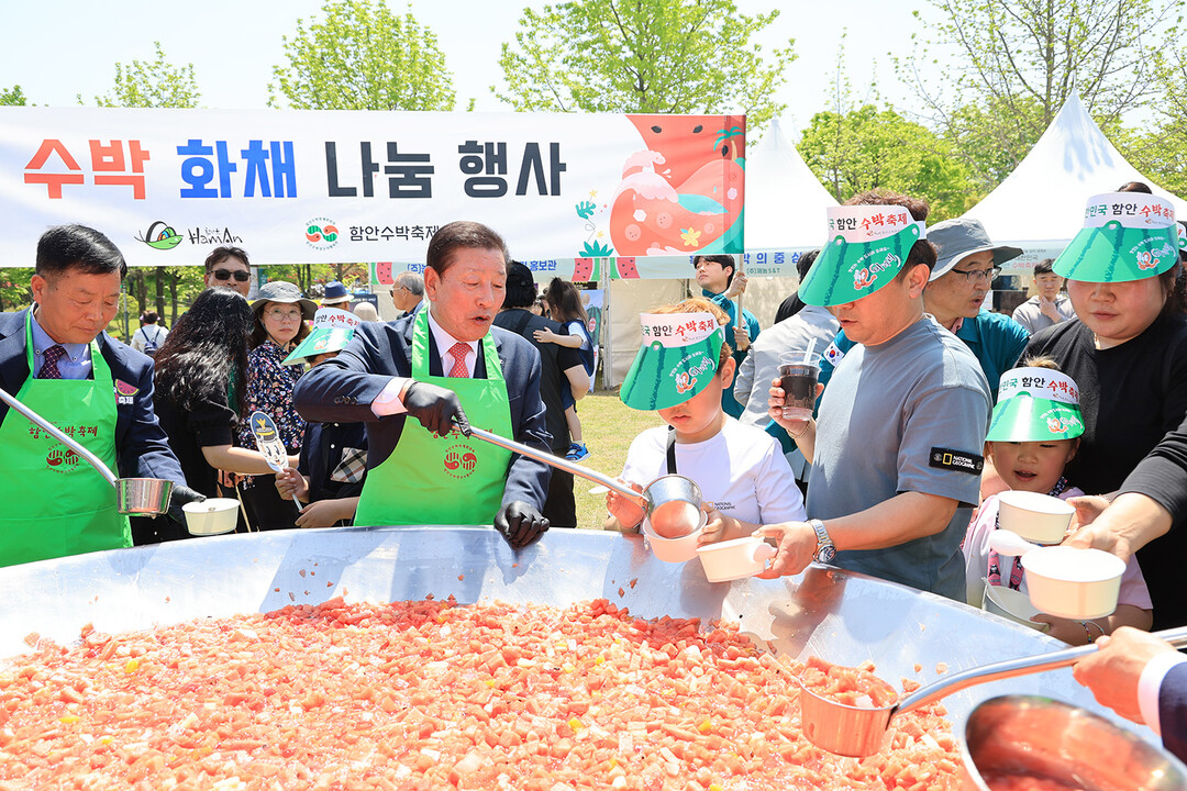 ▲지난해 수박축제에서 조근제 군수가 관광객들에게 수박화채를 나눠주고 있다. [함안군 제공]