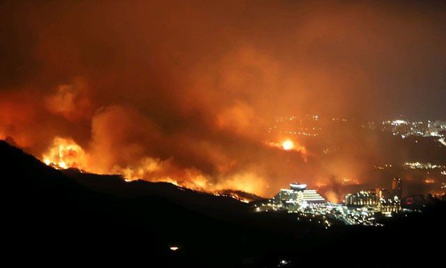 ▲ 지난 4월 4일 오후 7시 17분께 강원 고성군 토성면 원암리 미시령 인근 야산에서 산불이 발생했다. [강릉산림항공관리소 제공]