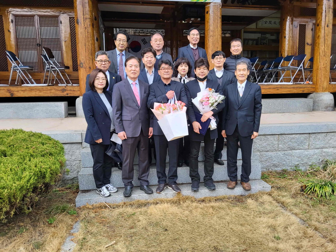 ▲ 5일 산외면 동산정에서 효우재단 관계자들이 효우상 시상식을 갖고 기념촬영을 하고 있다. [밀양시 제공]