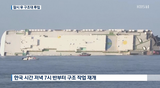 전도된 현대글로비스 소속 대형 자동차 운반선 안에 생존자가 있는 것으로 확인돼 당국이 구조 작업을 하고 있다.