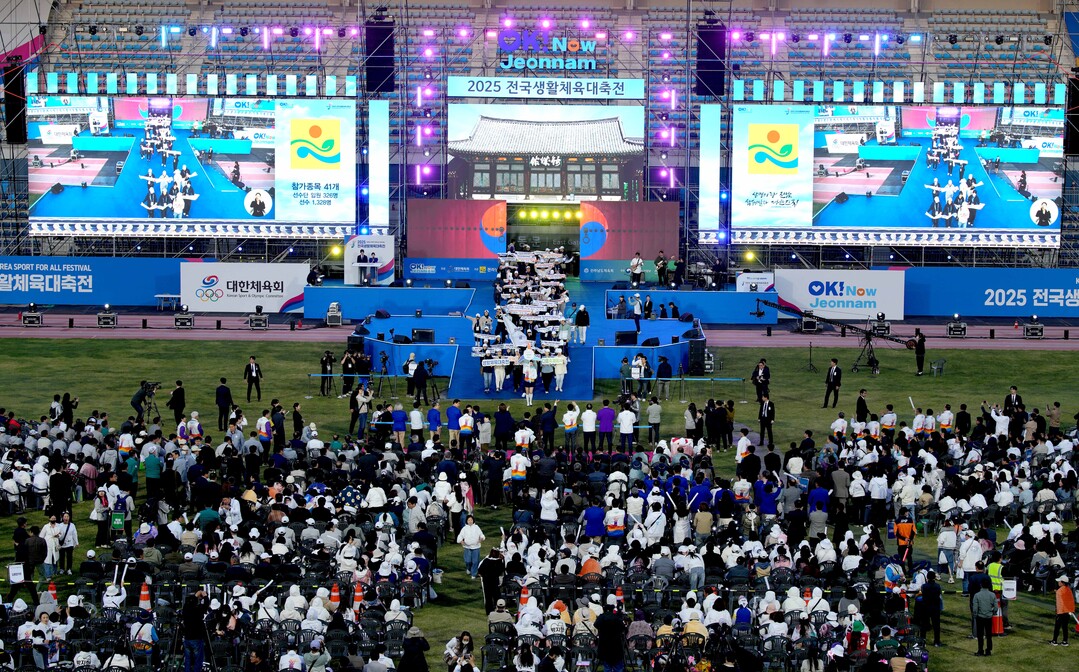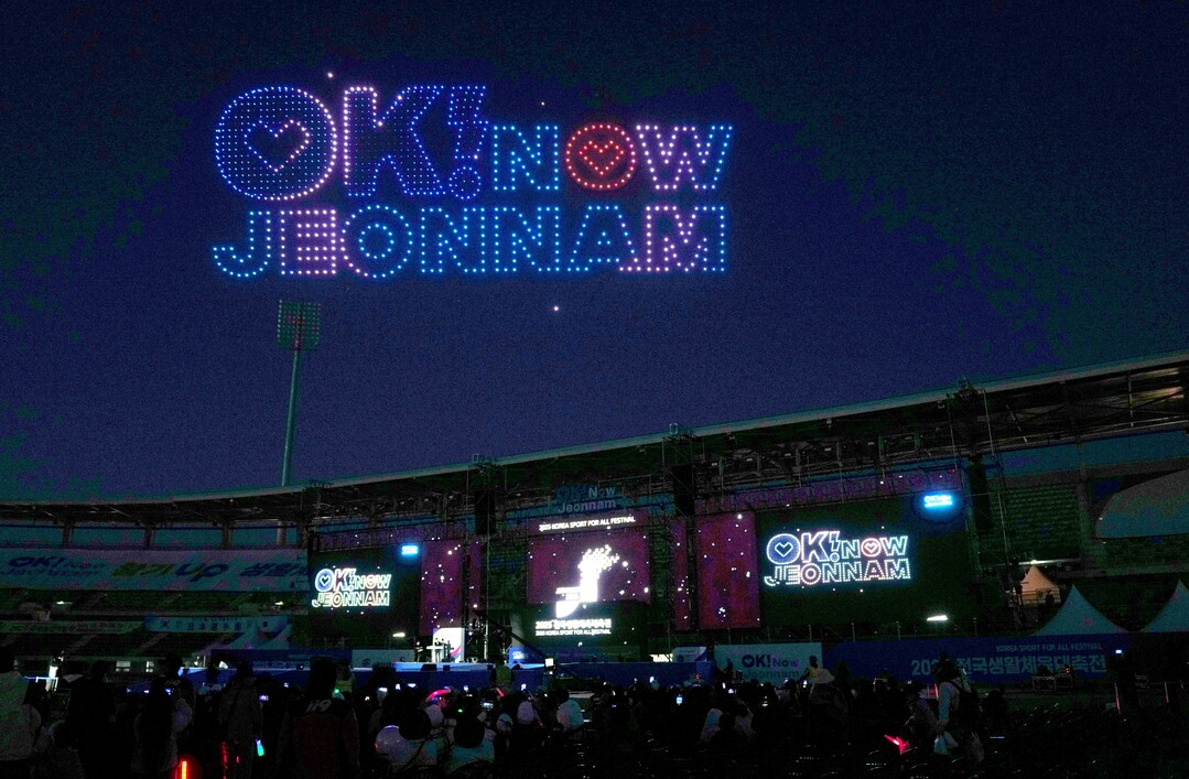 | ▲ 25일 오후 목포종합경기장에서 열린 2025 전국생활체육대축전 개막식에서 'OK! Now 전남, 활기 UP 생활체육!'을 주제로 드론 라이트 쇼가 펼쳐지고 있다. [전남도 제공] |