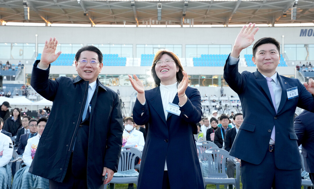 | ▲ 김영록 전라남도지사(왼쪽)가 25일 오후 목포종합경기장에서 열린 2025 전국생활체육대축전 개막식에서 유승민 대한체육회장, 장미란 문화관광체육부 차관과 함께 입장하는 각 시도 선수단을 환영하고 있다. [전남도 제공] |