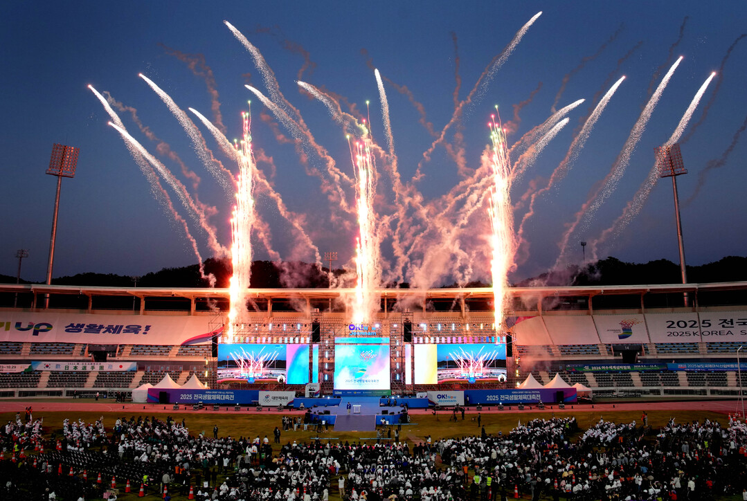 | ▲ 25일 오후 목포종합경기장에서 열린 2025 전국생활체육대축전 개막식에서 대회 개막을 알리는 폭죽이 밤하늘을 화려하게 수놓고 있다. [전남도 제공] |