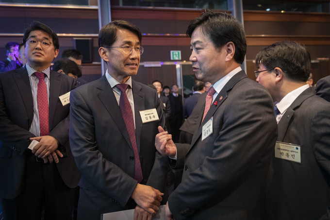 홍종학 중소벤처기업부 장관(오른쪽)과 김동욱 현대자동차 전무가 3일 오후 서울 강남구 코엑스 그랜드볼룸에서 열린 경제계 신년인사회에 참석해 이야기를 나누고 있다.