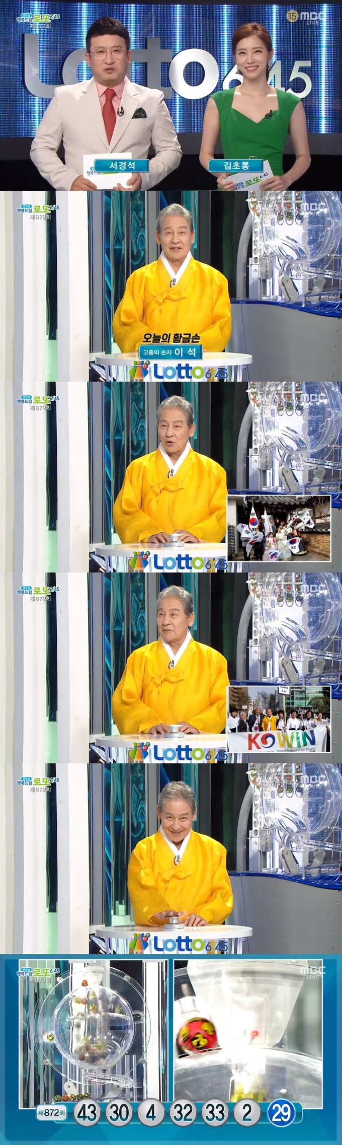 17일 방송된 MBC '생방송 행복드림 로또 6/45'에서는 제872회 로또복권 당첨번호 추첨이 진행됐다. 이날 방송에는 우리 역사 바로 알리기에 앞장서고 있는 고종 손자 이석 씨가 출연해 복권 추첨 버튼을 눌렀다.