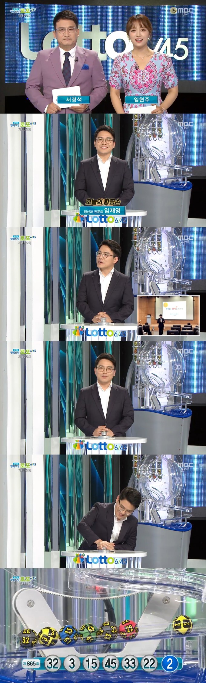 29일 방송된 MBC '생방송 행복드림 로또 6/45'에서는 제865회 로또복권 당첨번호 추첨이 진행됐다. 이날 방송에는 찾아가는 고민 상담소를 운영하는 정신과 전문의 임재영 씨가 출연해 복권 추첨 버튼을 눌렀다.