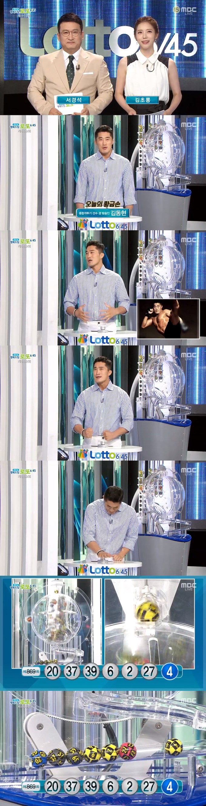 27일 방송된 MBC '생방송 행복드림 로또 6/45'에서는 제869회 로또복권 당첨번호 추첨이 진행됐다. 이날 방송에는 종합격투기 선수 겸 방송인 김동현이 출연해 복권 추첨 버튼을 눌렀다.