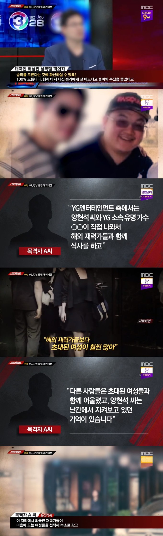 A 씨는 "하루 전날에도 고깃집에서 외국인 재력가 일행과 YG 측 관계자들이 식사를 했다"며 "이 자리에서 외국인 재력가들이 마음에 드는 여성들을 선택해 숙소에 갔고 그 여성들이 주로 다음날 XXX 식당의 저녁 식사에 나왔다"며 성접대 정황을 전했다.