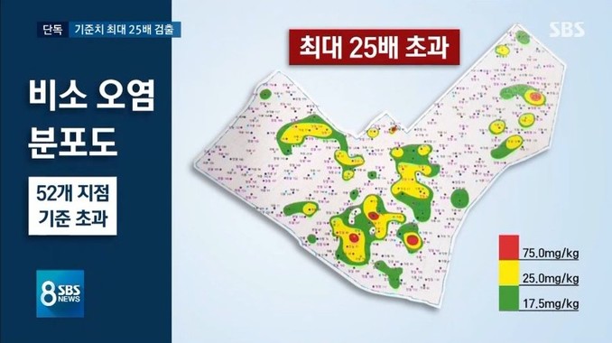 토양 정밀조사 보고서에는 1급 발암물질인 비소가 시료를 채취한 167개 지점 가운데 52개 지점에서 기준치를 초과했으며, 많게는 무려 25배가 넘는 양이 검출됐다. 또한 카드뮴과 니켈, 납 등 인체에 치명적인 중금속도 기준치를 초과했다.